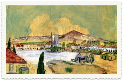 20. כשעזרא מינצר היה מגיע מהמוסד החינוכי במשמר העמק לבקר את הוריו במרחביה, היה מצייר את נופי מרחביה. בציור זה מפרי מכחולו של עזרא הונצחה חצר מרחביה.