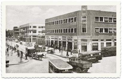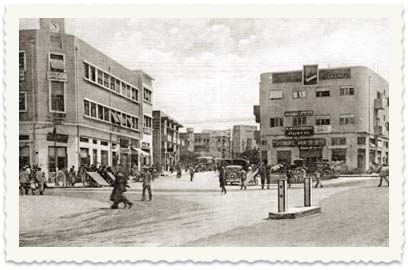 7. תל אביב. שלטים על הבית: רבינוביץ', ז. וילזניק. על האוטובוס: PALESTINE RAILWAYS