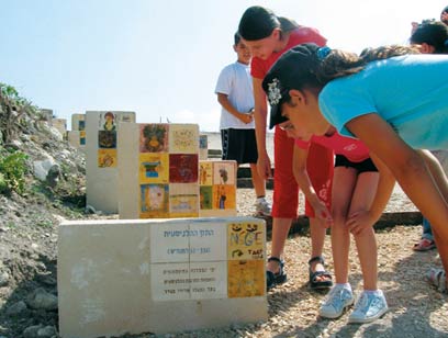 עולים לתל בציר הזמן. בשילוט שולבו אריחי קרמיקה