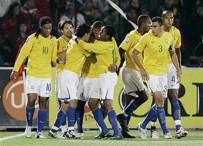 תשוקה, לא אהבה. שחקני נבחרת ברזיל חוגגים עוד גול (צילום: AP)