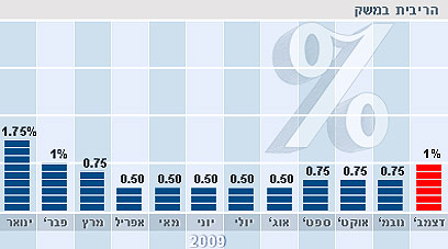 הריבית במשק לחודש דצמבר עלתה ב-0.25% ל-1%. כך הודיע היום (ב') בנק ישראל. ההחלטה הפתיעה את האנליסטים, שמרביתם העריכו כי למרות עליית המחירים, של 0.2% שנרשמה באוקטובר, יימנע נגיד בנק ישראל, סטנלי פישר מלהעלות את הריבית. גורם בבנק ישראל הסביר כי ההחלטה להעלות את הריבית החודש היא נקודתית ואינה מעידה בהכרח על ההמשך.