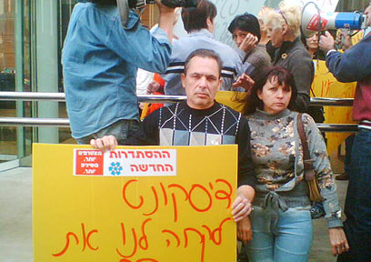 70 עובדי מפעל הטקסטיל מנהריה, שרובם לא קיבלו שכר כבר חודשיים, חסמו את הכניסה להנהלת בנק דיסקונט בת"א בשל סירוב הבנק לתת אשראי למפעל. מפגין: כשהבן מגיע מצה"ל הוא לא אוכל בשר ואומר ש"בצבא יש לי מספיק בשר, לכם אין"