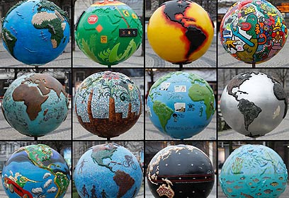 גלובוסים מצויירים שהוצבו מחוץ לאולם הוועידה (צילום: רויטרס)