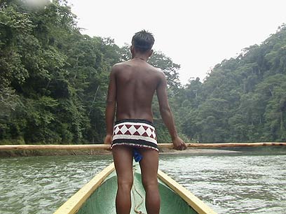 בני הכפר כולו נאספו על לשון יבשה ירוקה שיורדת לנהר. בצילומים שראיתי טרום-הגעה התלבושות היו מרהיבות וחוסר תלבושת אצל הנשים היה מרהיב לא פחות. ובכן, התאכזבתי, שכן האינדיאנית היחידה ללא חזיית חרוזים וכסף שמנה והחזה שלה נופל עד לטבור. מילא.