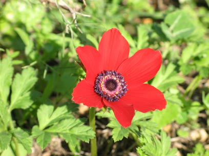 כלנית בודדה. ניתן לראות את תחילת פריחתה בין עצי יער אשתאול