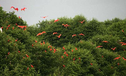 התקרבנו ולעינינו התגלה חיזיון מרגש: על העצים ישבו ציפורי האיביס האדומות, ואיתן ציפורי איביס שחורות ואנפות לבנות. הקפיטן כיבה את המנוע, ואנחנו עמדנו שם בשקט וצפינו ביופי. בעוד אנחנו מתבוננים התכסו השמיים באלפי ציפורי איביסים אדומות, שהתקבצו מכל עבר ונחתו על העצים בציוצים קולניים, שגררו קריאות התלהבות מצידנו.