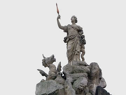 מזרקה ברוקית שופעת סמלים המעידים על נצחון אירופה על בבל, יוון ופרס