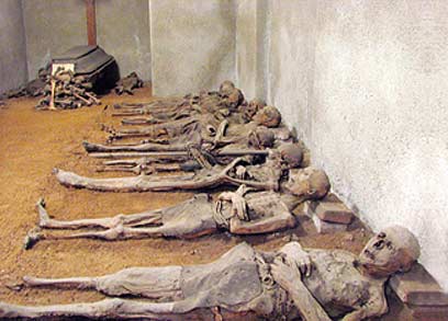 "כפי שאתה כיום גם אנחנו היינו פעם, כפי שאנחנו היום - תהיה גם אתה" כתוב על לוח אבן שסביבו מוטלות הגופות. הנקברים לא בחרו להיות "מוצגים" לעולמי-עד. דווקא משום שנשבעו לחיי עוני הם חסכו בארונות קבורה, ולאחר הלוויה הובלו למרתף שבו היובש והאוורור עזרו לשימור הגופות. בשל תנוחות חלק מהמומיות יש הסבורים שהאנשים נקברו בעודם בחיים.