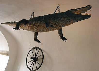 בכניסה אנחנו מוצאים עוד שני אלמנטים שבהם כרוכות אגדות: תנין מפוחלץ תלוי מעל, וגלגל עץ. התנין הגיע כמתנה מאחד הנסיכים בתחילת המאה ה-17, אבל זה לא מפריע לתושבי העיר לדבוק באגדה שהמפלצת הזאת שכנה בנהר.