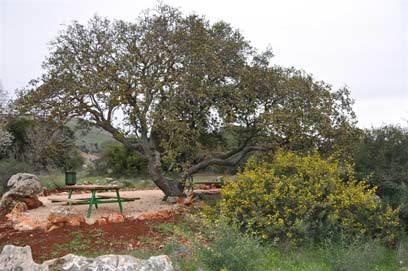 אלונים וקידה שעירה שפורחת בצהוב עז. חניון בדרך הרי נפתלי