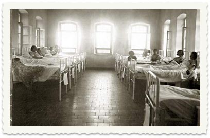 13. חולה מפונה לחדר המיון, שנות ה-50. באותן שנים שכן המוסד במתחם ביה"ח של המיסיון הסקוטי לשעבר, במרכז צפת. במבנים אלה פועלת כיום המחלקה הפסיכיאטרית של המרכז הרפואי "זיו"
