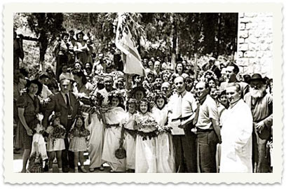 9. ילדי בית ספר בצפת מביאים ביכורים לביה"ח, 1946. ביה"ח נהג לקנות מדי שנה את ביכורי הילדים, שתרמו את התמורה לקק"ל