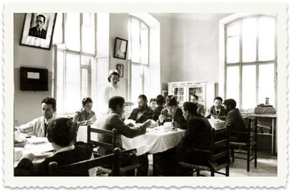 10. חולי שחפת בחדר האוכל של ביה"ח, שנות ה-40. על הקיר תצלומיהם של הרצל, ארלוזרוב ורחל המשוררת. מאחורי הסועדים ניצב ארון ספרים, חלק מ"ספריית רחל המשוררת" שהוקמה בבית החולים לזכר רחל