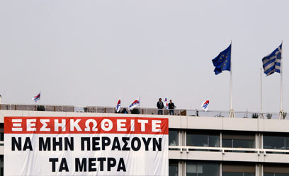 "התקוממו!" המפגינים על גג משרד האוצר באתונה (צילום: AP)