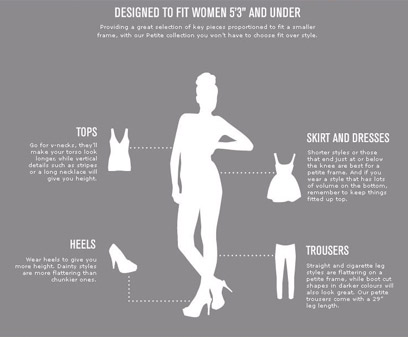 טופ שופ אכן מוכרים בארץ את קולקציית הפטיט שלהם. שמה עלול להטעות - היא לא מיועדת רק לרזות אלא מותאמת בדיוק לבנות שגובה אינה אחת התכונות הבולטות אצלן. המידות שם נעות בין 34 ל-40. והאורכים מתנמכים עד 27. יש לחברה גם קולקציית Tall שמותאמת לארוכות.
