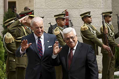 אבו מאזן וביידן, היום ברמאללה - לפני ה"פגישה הקשה" (צילום: AP)