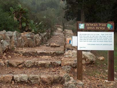 בצומת הדרכים המחומש שליד החניון (1) בוחרים במסלול שביל הבארות ובורות המים המסומן בסימון שביל ישראל (לבן-כחול-כתום), ומשולט לפרקים. השביל חוצה את החניון בין שולחנות הפיקניק. בתחילת המסלול, בסמוך לחניון, שוכן בור מים חצוב בסלע, ולידו טרסה משוחזרת.