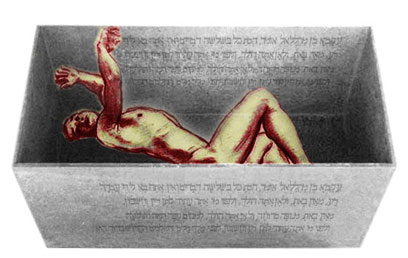 "שאו שערים ראשיכם ופנו דרך לארונו של בר כרם המנודה" (מדרש תמונה מאת יונה ארזי)
