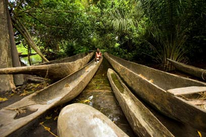 סירות קאנו מעץ שמשמשות את הקונגולזים בשיט על נהר הקונגו