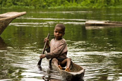 הנהר הוא עורק החיים העיקרי של הכפריים. ילד שט בנהר הקונגו