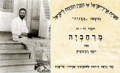 1. יוסף רבינוביץ', מזכיר הקואופרציה מרחביה, על מדרגות אחד מבתי האבן בקואופרציה. לידו כריכת הספר שכתב על הקואופרציה