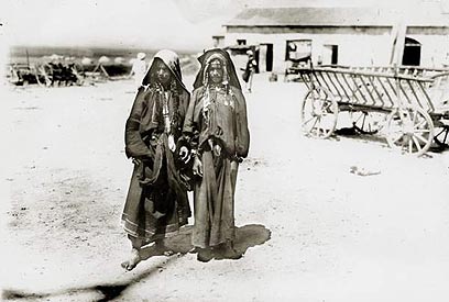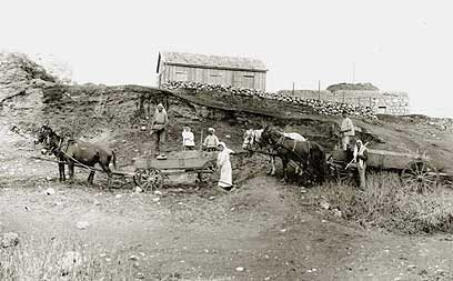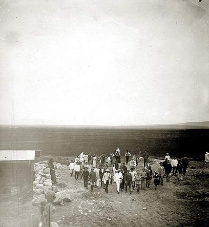 4. בשנת 1911 מגיע פרנץ אופנהיימר (בחליפה לבנה) לבקר את אנשי הקואופרציה ששכנו עדיין בחושות של האריסים על תל פולה, סביב התל שממה.