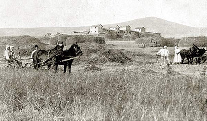 7. גלויה מצולמת של הצלם בן-דב: על התל פולה נבנו צריפי עץ גדולים ששימשו את המתיישבים לבעלי חיים, לציוד וליבול עד לגמר בניין החצר. הגורן היה ליד התל