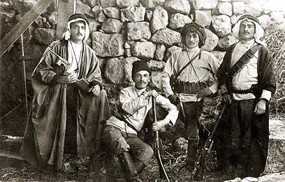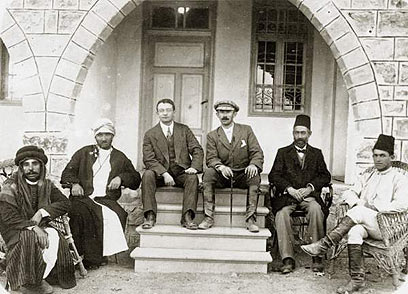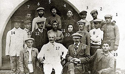 16. 13 במאי 1913, לאחר חתימת הסכם שלום עם מנהיגי הבדואים בסביבת מרחביה. מימין: שמאי אלטשולר, על המדרגות האגרונום - שלמה דיק, ומשמאלו המהנדס וילהלם הקר