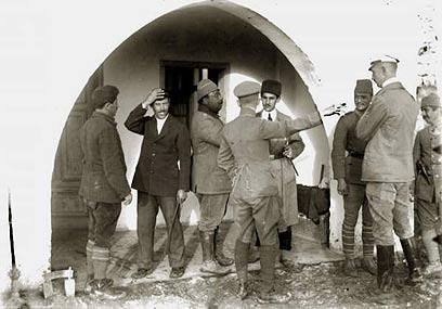 17. עם גילוי מחתרת ניל"י נודע למשטרה התורכית שחבריה עברו במרחביה. מיד יצאו שוטרים למקום. בתצלום: שוטרים בחיפוש בבניין המשק. מימין: וואלץ, מפקד הטייסת הגרמנית 304, אשר הייתה ליד מרחביה. משמאל משולם גפנר.