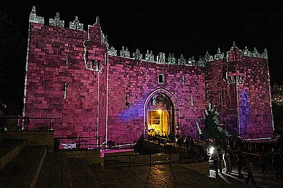 הקרנות על בניינים. שער שכם מואר בוורוד (צילומים: רון פלד)