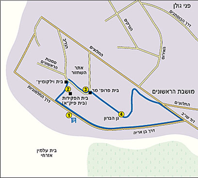 בין בתי הפקידות יורדות מדרגות אל גן הברון (4) שהוקם ב-1886. בריכות הדגים, המזרקות וחלק מהצמחייה בגן הם מקוריים ושימשו את פקידי הברון ומשפחותיהם. יוצאים משער הגן אל רחוב החלוצים ויורדים במורד המרוצף. בתי מתיישבי העלייה הראשונה שהגיעו מרומניה, נבנו משני עברי הרחוב וכללו בית מגורים מאבן מקומית וחצר רחבת ידיים. חלק מבתים אלו הפכו לצימרים המבוקשים של ראש פינה. בצומת הבאה פונים ימינה לדרך שו"ב ולאחר כ-100 מטר שוב ימינה בכביש שעובר לצד נחל ראש פינה אל בית העלמין (1).