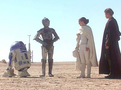 C-3PO בחברת אנקין, פאדמה ו-R2D2. פורח בשממת טטואין (צילום: MCT)