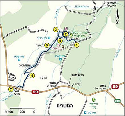 המטיילים במסלול הבינוני והארוך ימשיכו גם הם בשביל. עוד מעט, ממש בלי משים, נמצא את עצמנו לוטשים עיניים במי נחל שניר (3). המסלול מתחיל במקום בו נפגשת "תעלת דן-שניר" הצפונית עם נחל שניר עצמו, שם נוצר מין אי קטן. בקיץ אפשר לבצע מעין ניסוי מדעי בצפון האי: טובלים רגל במי השניר ורגל במי הערוץ שבו זורמים מי הדן ומשווים את הטמפרטורות.