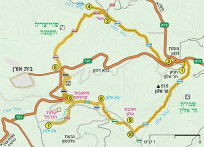 בהמשכה יש תצפית לעבר קיבוץ בית אורן. לאחר כ-2 ק"מ מגיעים עם הדרך האדומה לצומת הכניסה לבית אורן (5). כאן נפגשת הדרך עם כביש בית אורן-צומת דמון (כביש 721). חוצים את הכביש לעברו השני (הדרומי), ומתקדמים הלאה במורד דרך עפר מסומנת שחור.