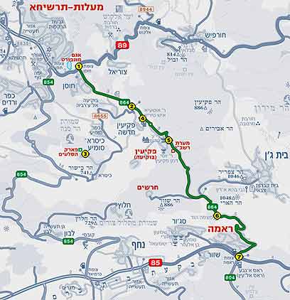 בצומת חוסן (1) על כביש 89, פונים דרומה לכביש 864. כאן מתחיל המסלול. את הצומת הזה ואת הכביש הנמשך ממנו אפשר לראות כקו גבול דמיוני, קו הגבול המערבי של אזור מרום הגליל. שני גושי הרים גבוהים רכס הרי פקיעין ורכס הרי מירון מתרוממים כאן זה מול זה. בגלל גובהם, כל הכבישים באזור פשוט עוקפים אותם.