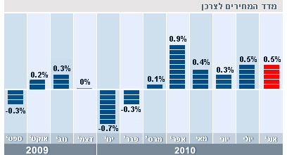בחודש יולי עלה מדד המחירים לצרכן בשיעור גבוה מהרגיל, כמו בכל שנה, אלא שהפעם נרשמה עלייה של 0.5% בלבד, שיעור נמוך יחסית ליולי 2009 (1.1%) ולהערכות המוקדמות שדיברו על זינוק של 0.8%.