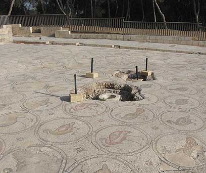 מרחק 800 מטרים בדרך הים, משתרעת חורשה מצד שמאל של הכביש, ושלט הכוונה מורה שמאלה אל פסיפס הציפורים. הפסיפס הענק שימש כרצפת החצר המרכזית של ארמון ביזנטי ששכן מחוץ לחומות העיר. הפסיפס עצמו באורך 16 מטרים וברוחב 14.5 מטרים, מורכב מ-120 מדליונים ובכל אחד מהם עוף - טווסים, שקנאים, חסידות, פסיונים, אנפות ועוד. המדליונים ערוכים ב-12 שורות, ומתוכננים כך שכל אלכסון מציג את אותה ציפור. מסביב למדליונים מסגרת שבה משולבים עצי פרי ודמויות בעלי חיים, והמראה מרהיב.