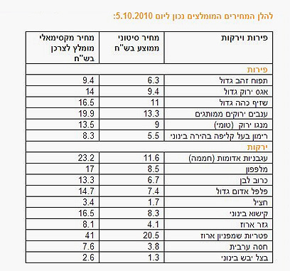 *מתוך אתר משרד החקלאות. נוסחת חישוב המחיר המקסימלי המומלץ קובעת כי מחיר הירקות המקסימלי המומלץ לצרכן, גבוה ב-100% מהמחיר הסיטוני שלהם; ומחיר הפירות המקסימלי המומלץ לצרכן גבוה ב-50% מהמחיר המקסימלי המומלץ שלהם.