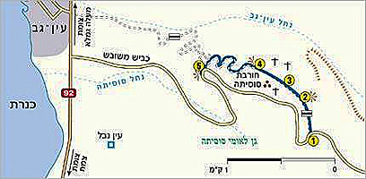עולים על השביל השחור שמצפון לחנייה (1) ומטפסים לשלוחת סוסיתא. מיד עם תחילת הטיפוס תגלו ארונות קבורה עשויים אבן (סרקופג, בארמית) וקיר אבן ארוך (משמאלכם), שהיוו חלק ממערכת המים של העיר. נכנסים לעיר מהשער המזרחי שלה (2) על פסגת ההר, כ-350 מטר מעל הכינרת, מונחים שרידי עיר יוונית-רומית מפוארת, שישבה כאן מהתקופה ההלניסטית ועד הכיבוש הערבי. העיר נודעה בשמה היווני אנטיוכיה היפוס, שמשמעו "סוס", ומכאן שמותיה בעברית ובערבית: סוסיתא וקלעת אל-חוּסאן (מבצר הסוס).