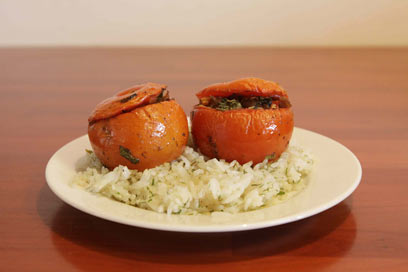 - העגבניות: ממלאים את העגבניות הריקות בירקות, ומניחים עליהן את הכיפה.