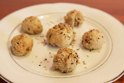 - מברישים את הכדורים במעט מים, ומפזרים מעל הבצק מעט שומשום או קצח ומעט מלח גס (רצוי הימלאיה) ואופים בתנור שחומם מראש לחום גבוה של 200 מעלות כ- 12 דקות.