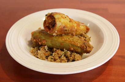 קישואים ממולאים בקינואה, בטטה ופלפל חריף ברוטב עגבניות