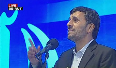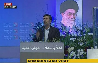 נסראללה לא יצא מהמחבוא, אחמדינג'אד קיבל את ההמונים לבדו - ואיים על ישראל, לא הרחק מגבולה הצפוני. נשיא איראן, מחמוד אחמדינג'אד, המבקר בלבנון - נאם הערב (יום ד') במעוז הארגון בביירות - רובע ה"דאחיה". העצרת המרכזית שכינסו עבורו ארגוני חיזבאללה ואמ"ל בלבנון נערכה באיצטדיון כדורגל מקומי, שם התקבל אחמדינג'אד בקריאות קצובות מפי רבבות בפרסית: "ברוך הבא". ההמונים הניפו את דגלי איראן, ואחמדינג'אד נופף להם בחזרה.
