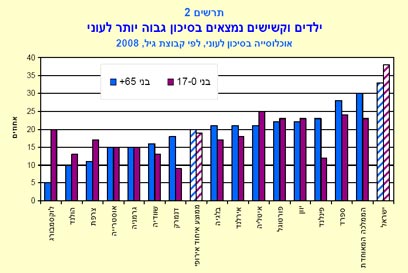 38% מהילדים בישראל נמצאו בסיכון לעוני, לעומת 19% באיחוד האירופי, ו-33% מהקשישים נמצאו בסיכון כזה לעומת 20% בממוצע באיחוד. לשם השוואה, בשנת 2000 הגיע הסיכון לעוני בישראל לרמה של 27%.