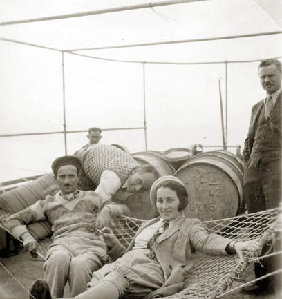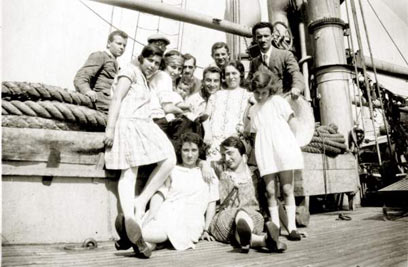 1926 על האוניה חזרה לארץ ישראל. שלושה בני משפחת שוורץ יצאו לאנגליה - וחזרו ארבעה. בתם ראומה נולדה בחו"ל. בתצלום היא עומדת מימין לפני אביה צבי. בקבוצה היו עוד ילדים של סטודנטים חוזרים. משמאל עומדת דינה פבזנר ומימין לה (עם סרט לראשה) רות שוורץ.