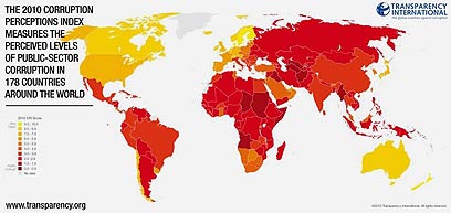 מנתוני עמותת שבי"ל (שקיפות בינלאומית ישראל), הסניף הישראלי של ארגון Transparency International העורך את הדו"ח השנתי, עולה כי המדינה הכי פחות מושחתת היא דנמרק שקיבלה ציון 9.3. ניו-זילנד, עם ציון דומה, במקום השני. סינגפור מדורגת שלישית ואחריה פינלנד, שבדיה, קנדה, הולנד, אוסטרליה, שוויץ ונורבגיה.