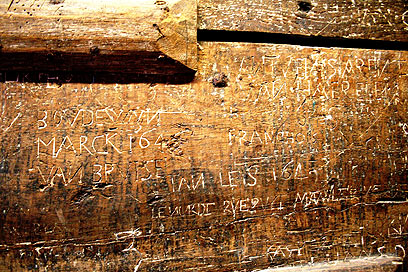הקירות מכוסים בקורות אלון עבות ורחבות, המוחזקות באמצעות מלחציים ממתכת, ועמוסות בחריטות צפופות, אך ברורות, של מילים, שמות, תאריכים וציורים רבים. כל אלה מייצגים בצורה אילמת את האסירים הרבים שנכלאו פה בתקופות שונות, כאשר הטקסט הקדום ביותר שנמצא הוא משנת 1577 (כ-50 שנה לאחר בניית המבנה).