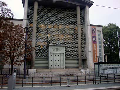 בית הכנסת בשטרסבורג. מימין - הכרזה למען שליט