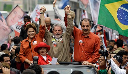 קמפיין הבחירות בברזיל. דה סילבה במרכז, רוסף משמאלו (צילום: AP)