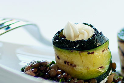 המנה מורכבת מפרוסות זוקיני צלויות על מחבת פסים (אפשר גם בגריל התנור) שבתוכן מתחבאת לה מוס גבינת עיזים (ואפשר גם שמנת) והשילוב הנ"ל מונח לו ברכות על כרית של סלט עדשים שחורות ועשבי תיבול ריחניים. ביס מכל הטעמים יוצרים את הביס המושלם שיכול להעלות חיוך ועונג בפה הסועד.